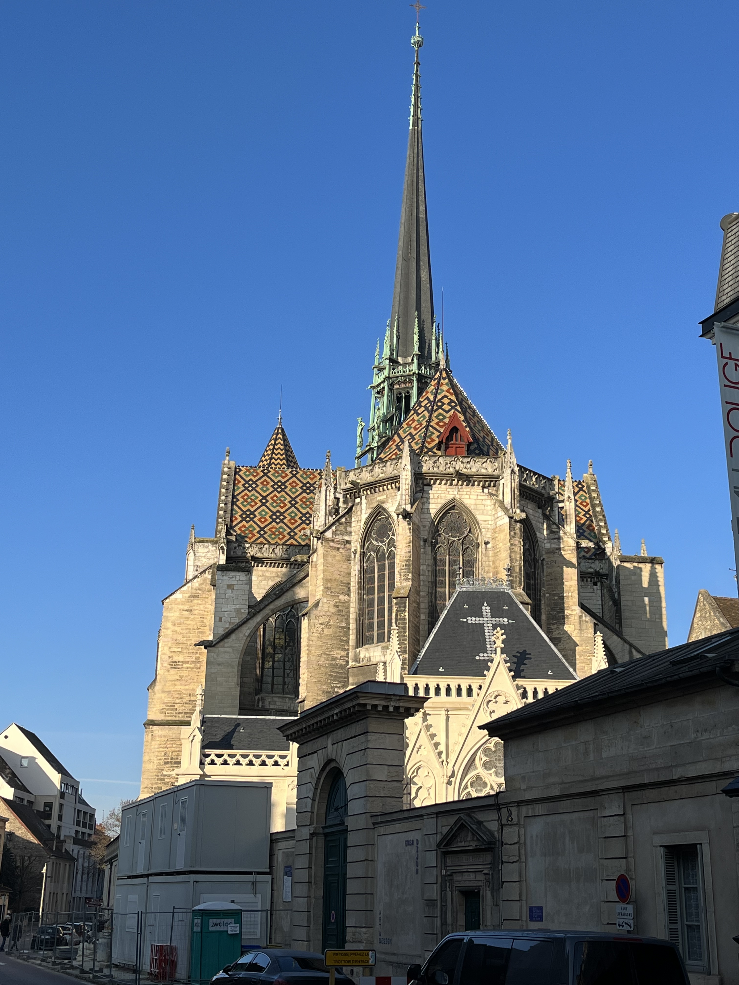 During our stay here we’ve seen several historic public buildings being upgraded. For example, the Musee des Beaux-Arts, which was completely renovated in the last five years, similarly, the regional and county courthouse complex, or the new boat house under construction at Lac Kir, or the Piscine Carrousel where we enjoy swimming. You can also see it in the abundance of pubic employees who daily wet clean the entire pedestrian zone in the inner city, or clean public signs and benches in the parks, or the frequent sightings of city police patrolling the inner city on food or bicycle. Instead of the often observed decline in public investments in other places, Dijon appears to be constantly maintaining and upgrading.